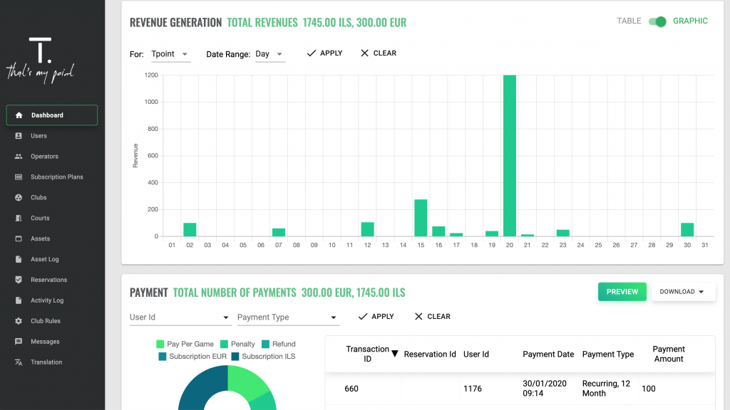 TPoint’s Sports Facility Management Solution (SFM) Transforming facilities old and new into digital experiences PLAYER APP Club registrationOnline booking and paymentSubscription managementMember-to-member invitation featureMember chatReal-time court control: Open/close court, music selection, lighting and AC, game recording for saving or sharingGame scores trackingPush and email notifications SFM MANAGEMENT PANEL Player managementRevenue managementSubscription plansLoyalty programGames management: from creation to cancellationEquipment management, tracking and reportsAutomated club management & policy setupData on court usage and player stats
